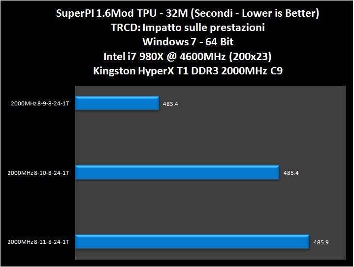 Come si vede chiaramente dagli screen e dal grafico, la sola variazione del TRCD porta a un notevole impatto sulle prestazioni, causando la perdita di qualche secondo nel calcolo del 32M. Precisiamo che 2-3 secondi in quel test sono veramente un’enormità. Nel normale uso quotidiano, invece, difficilmente noteremo differenze.